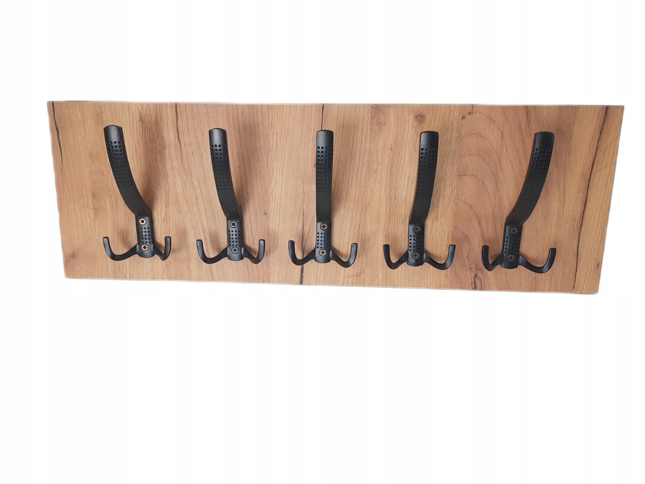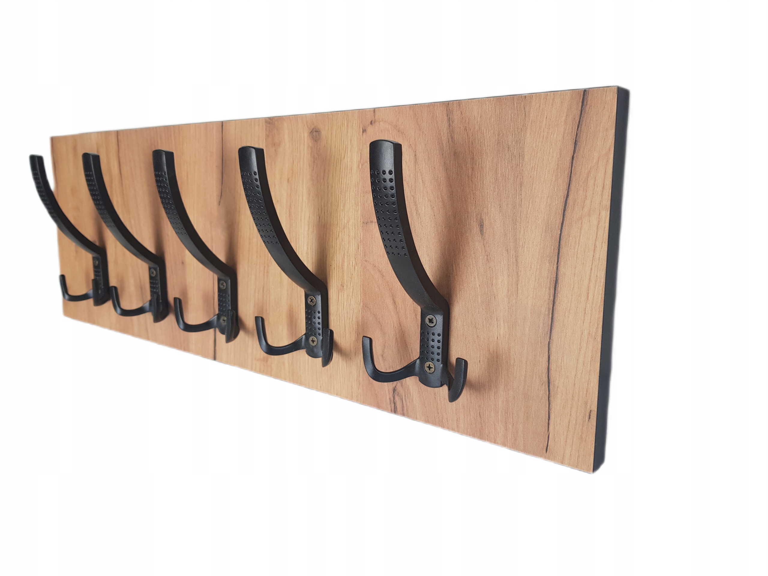 Oferuję wieszak wiszący do przedpokoju. Bardzo pojemny a przy tym kompaktowy, zawiera 5 potrójnych mocnych metalowych haczyków. Wykonany z płyty meblowej obustronnie laminowanej. Kolor dąb złoty craft, obrzeża dopasowane do koloru haczyków w kolorze czarnym. Wieszaki produkujemy w naszej stolarni.
